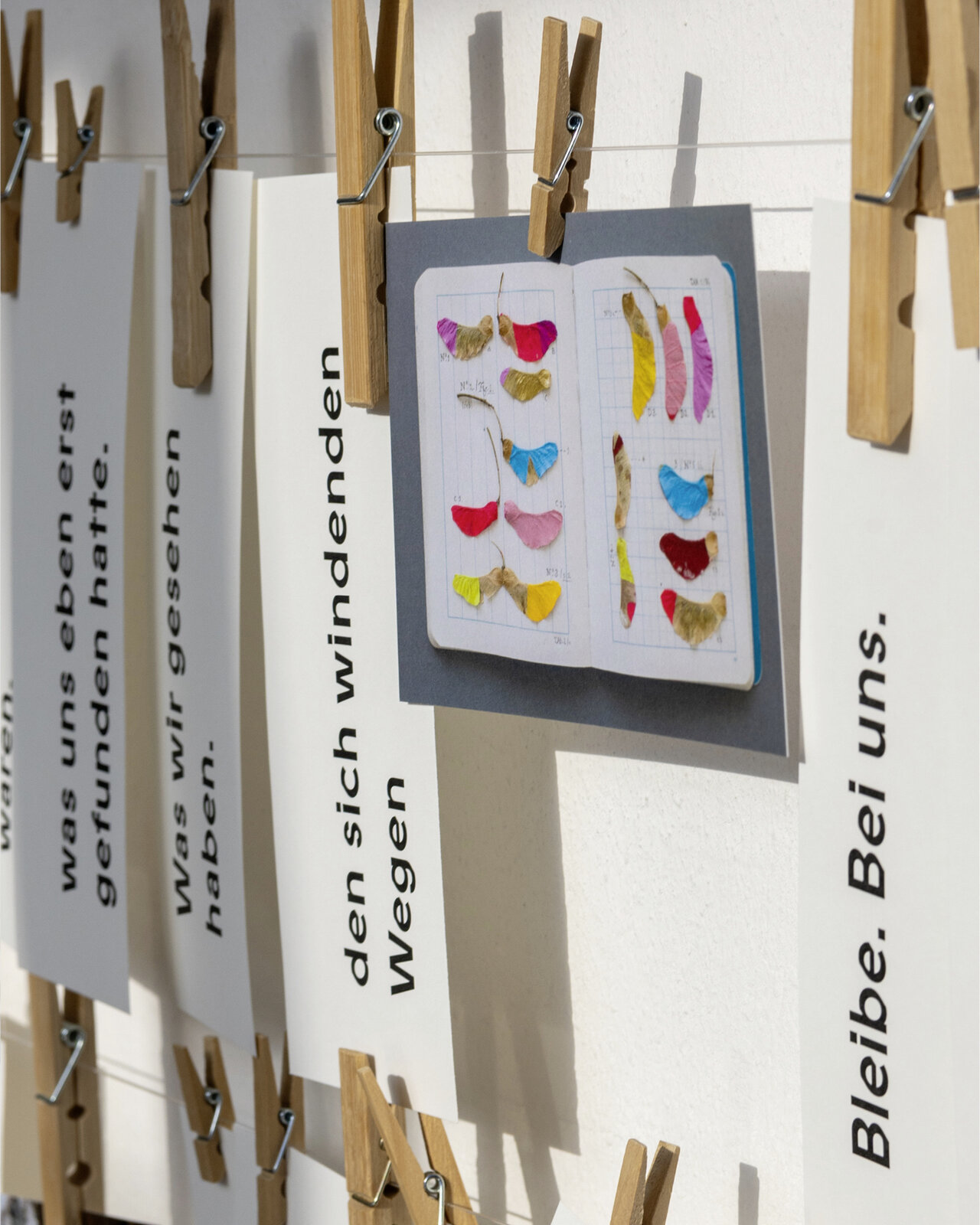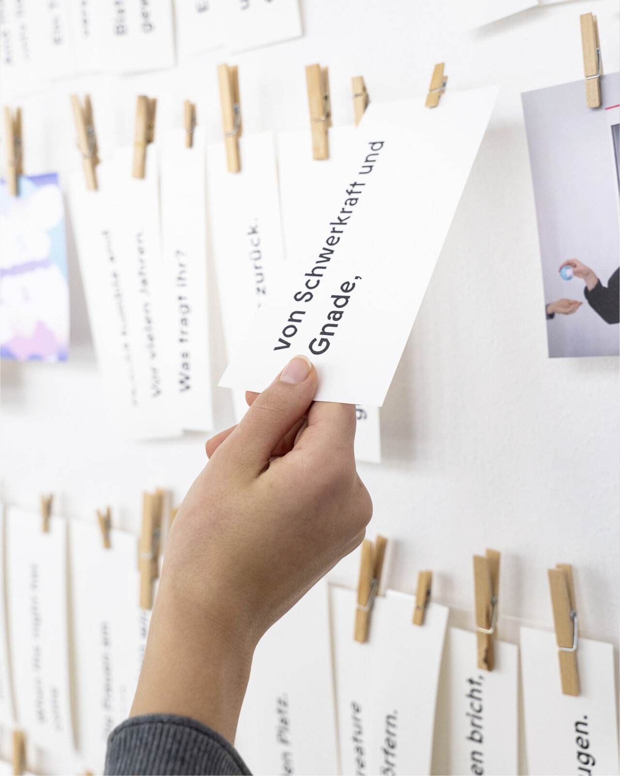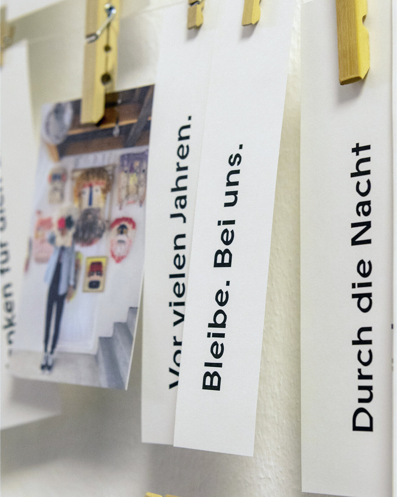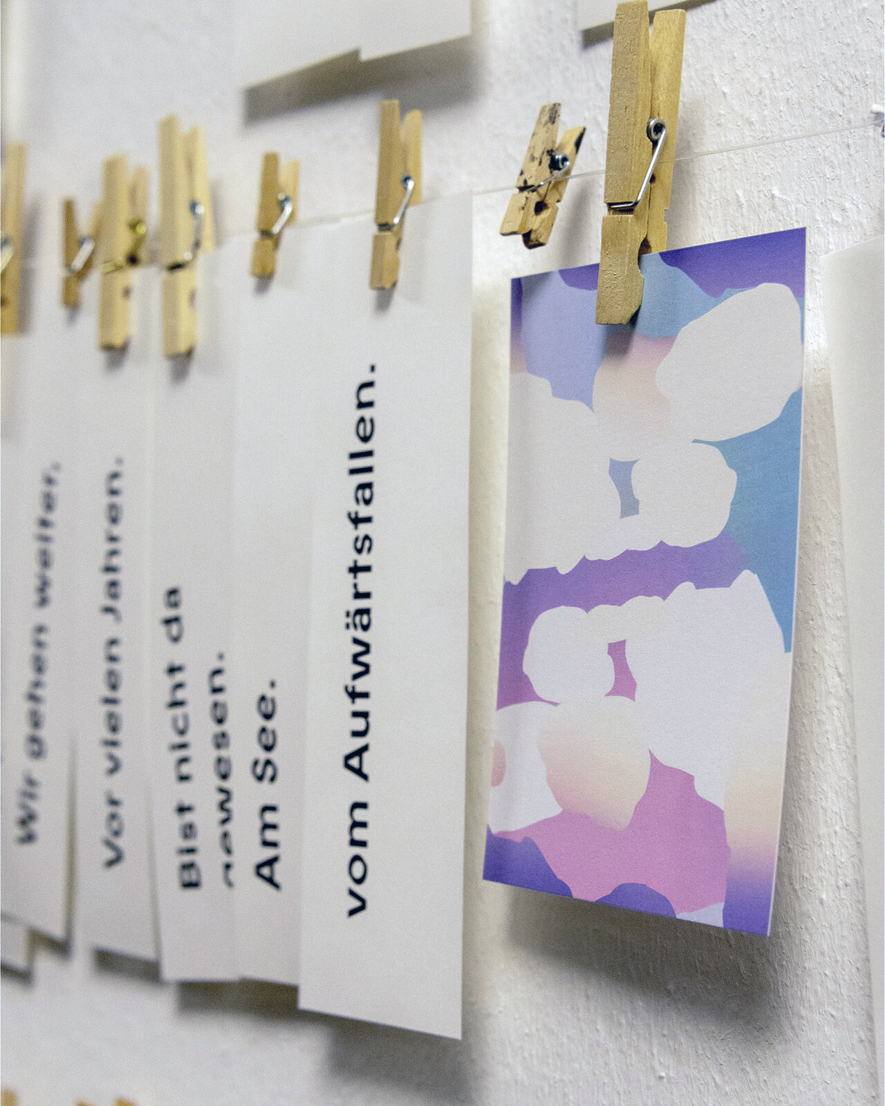 Pflück dir was. An unserer Zettelinstallation im Glasgang des LÜCHTENHOF. Eine Karte von Franca Neuburg. Dazu Wortschnipsel aus der neuen alten Emmaus-Geschichte von Dirk Brall in die Gegenwart gelesen. Daneben Liedzeilen. Reiseproviant für unterwegs.