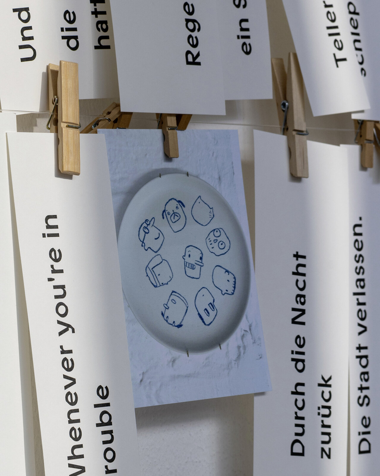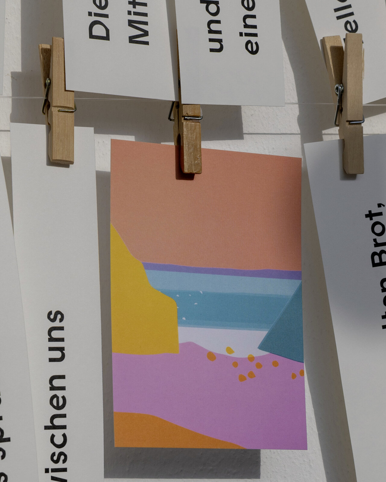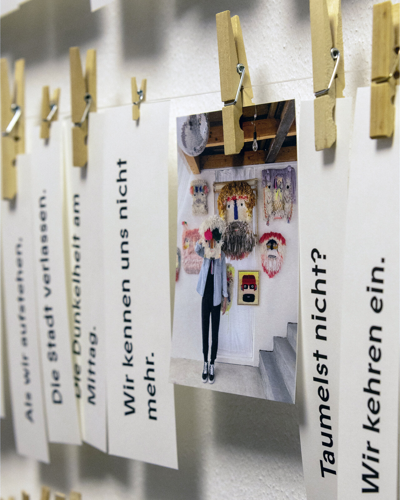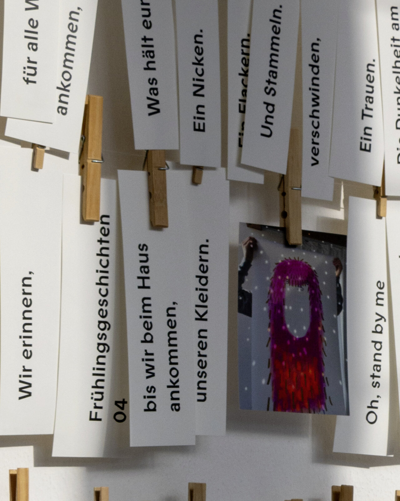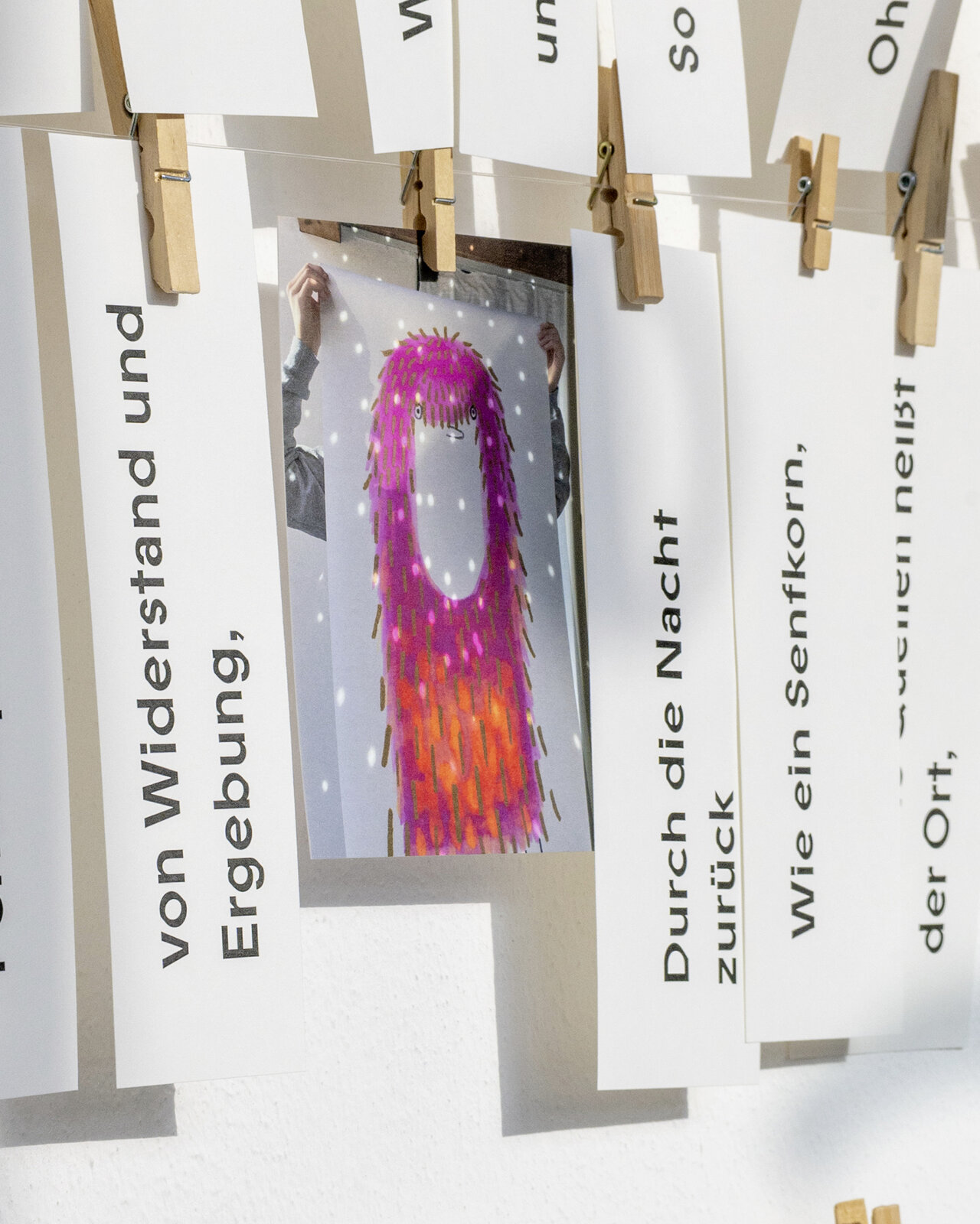 Pflück dir was. An unserer Zettelinstallation im Glasgang des LÜCHTENHOF. Eine Karte von Franca Neuburg. Dazu Wortschnipsel aus der neuen alten Emmaus-Geschichte von Dirk Brall in die Gegenwart gelesen. Daneben Liedzeilen. Reiseproviant für unterwegs.