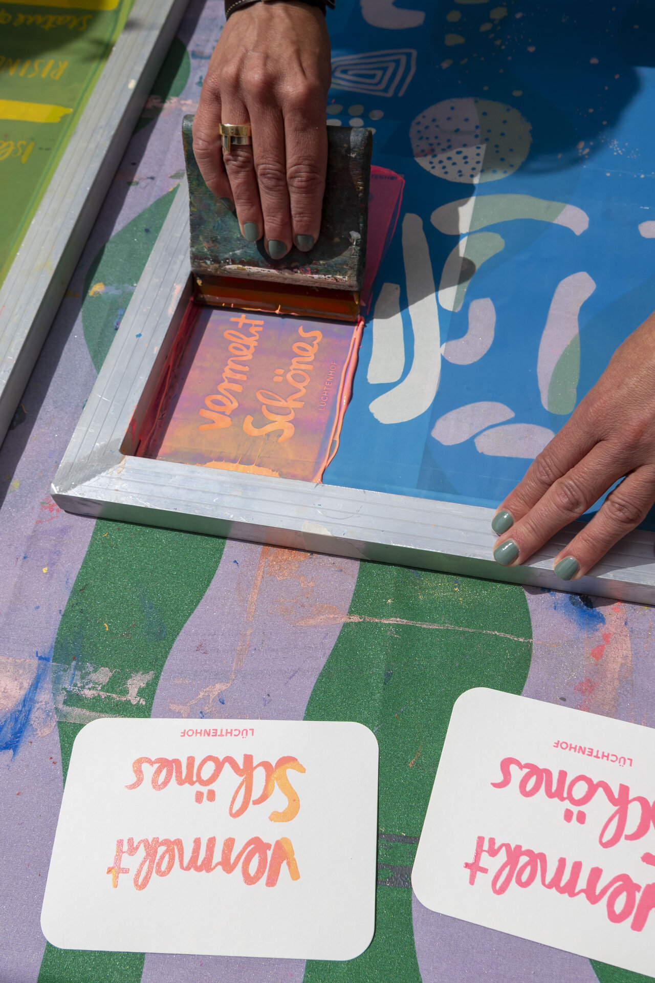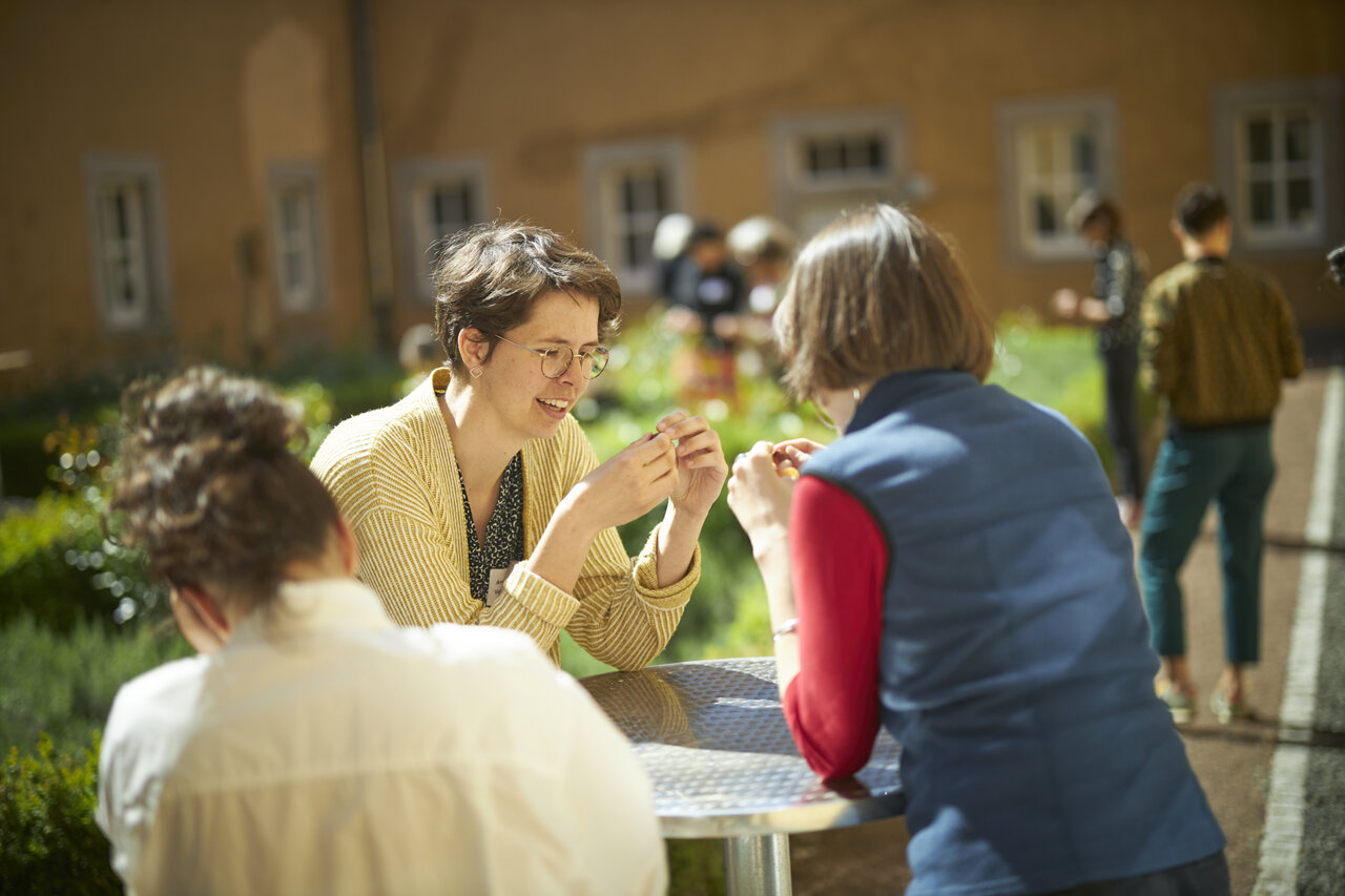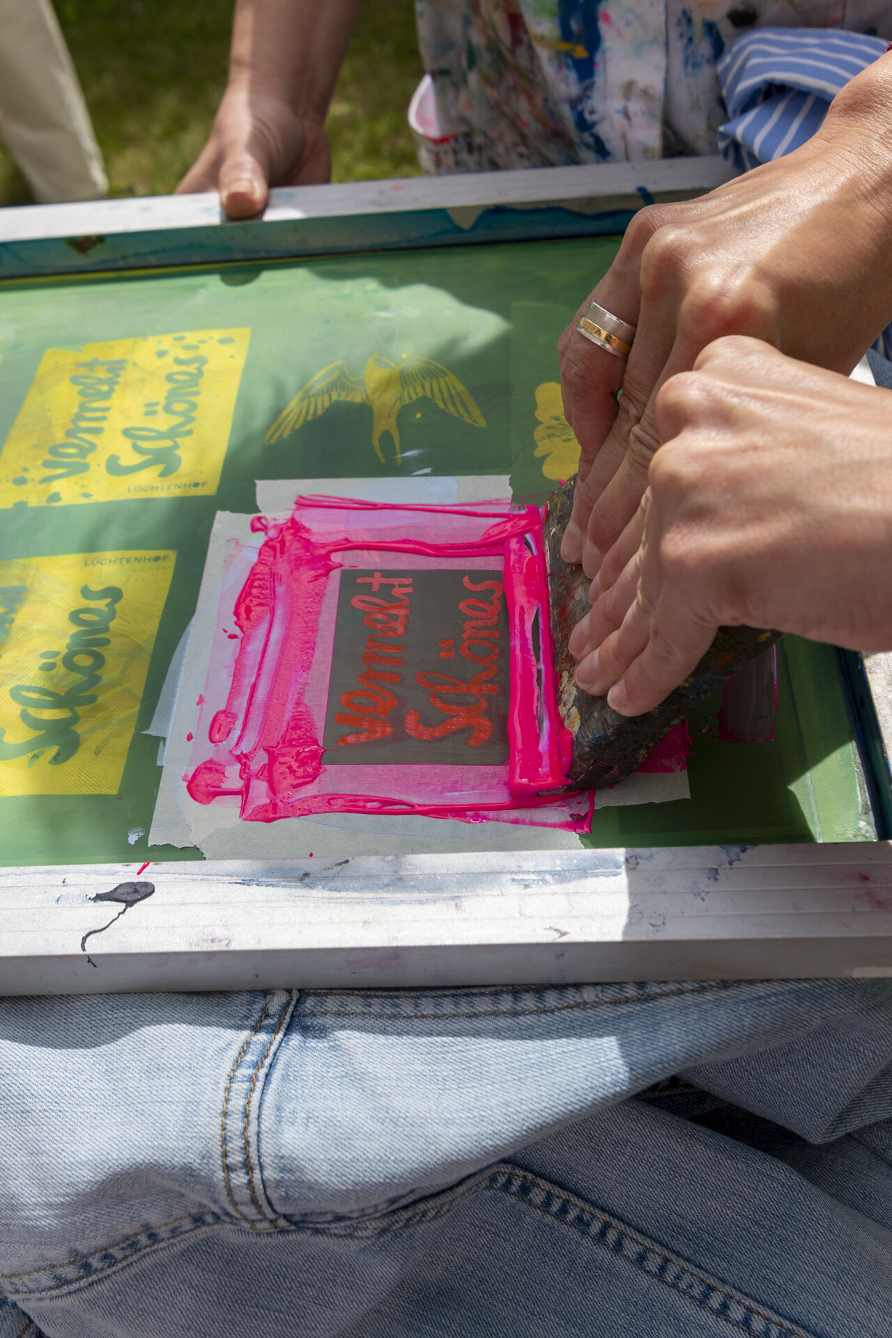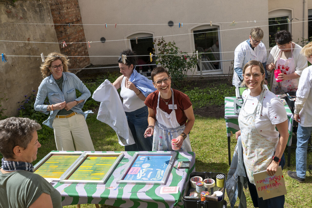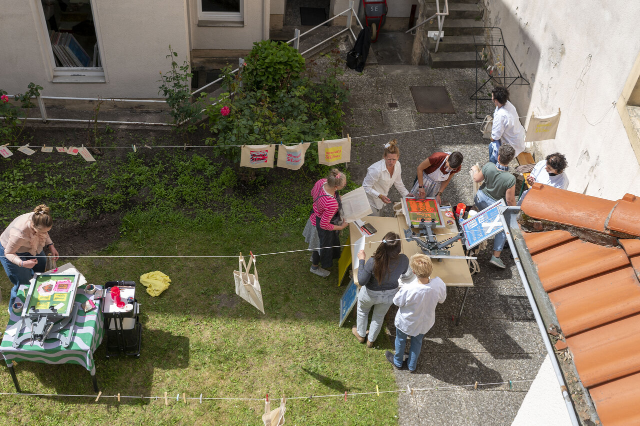 In Werkstattzeiten das Gehörte vertiefen und Schönes vermehren. Beim Siebdruck mit Werkstattleiterin Ann-Kathrin Blohmer und bei der Polaroidphotographie mit Eva Jung. Oder einfach durch die Gärten streifen, in der Bibliothek stöbern und die Ausstellung von Donata Wenders sichten.