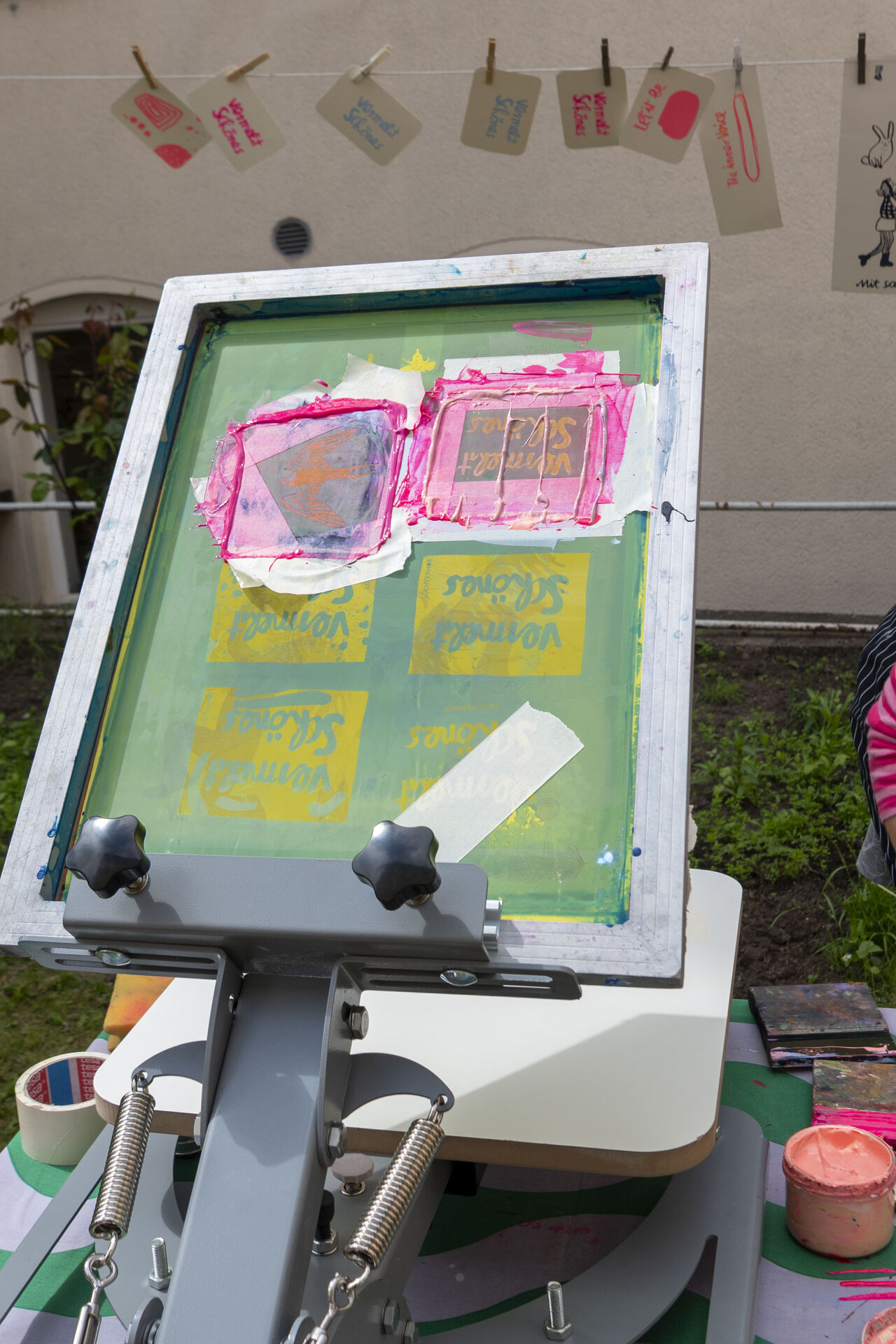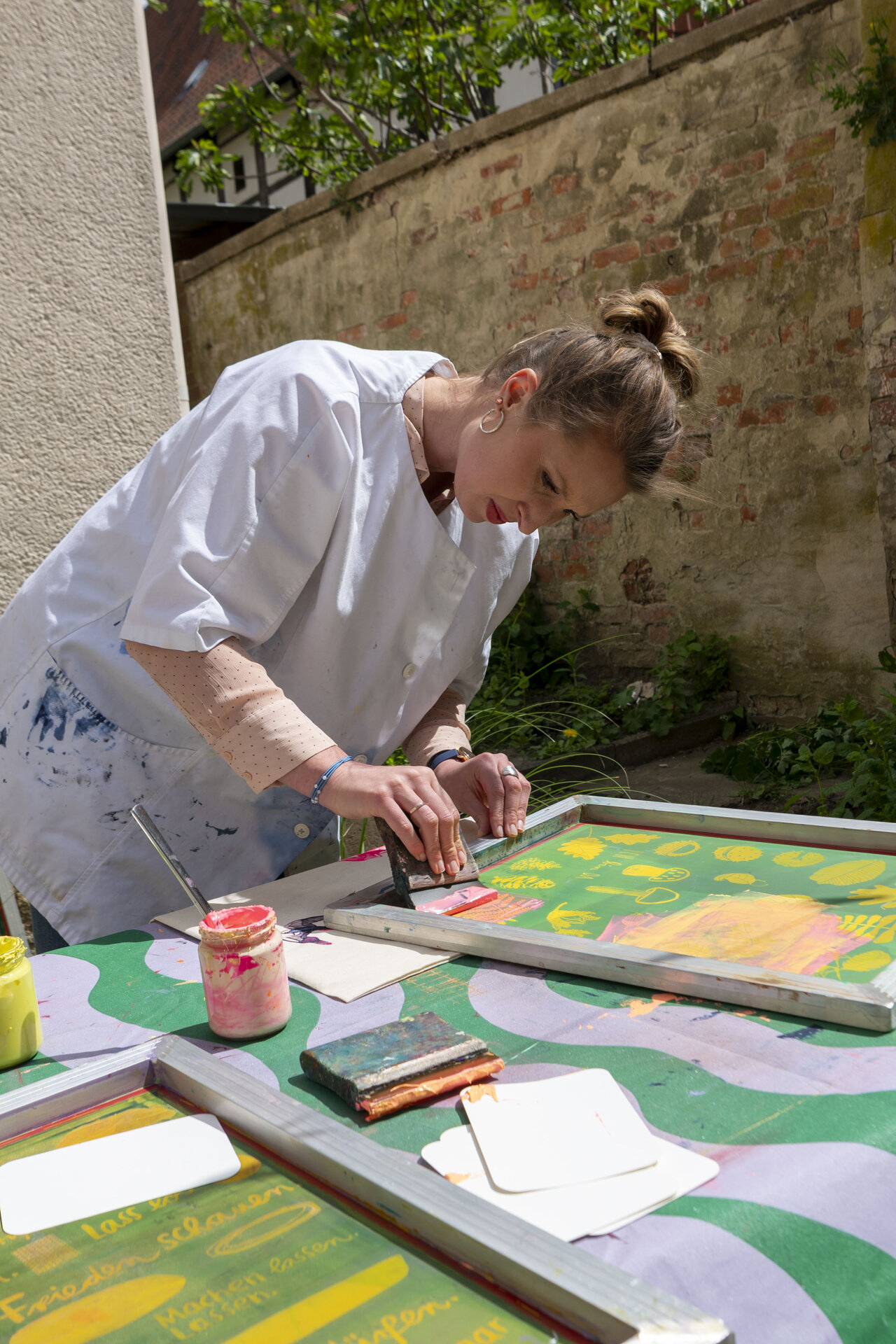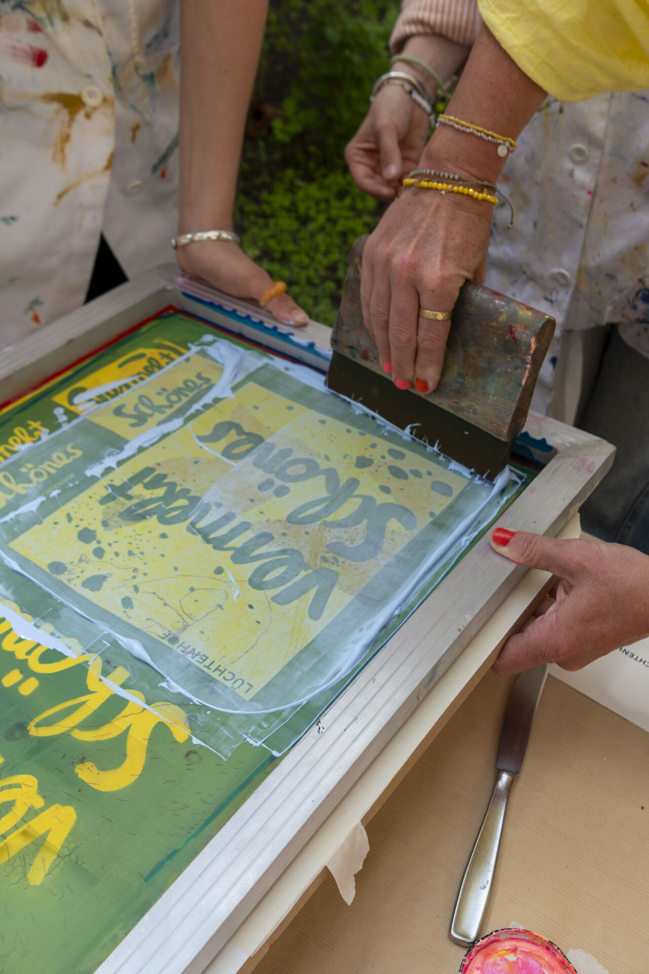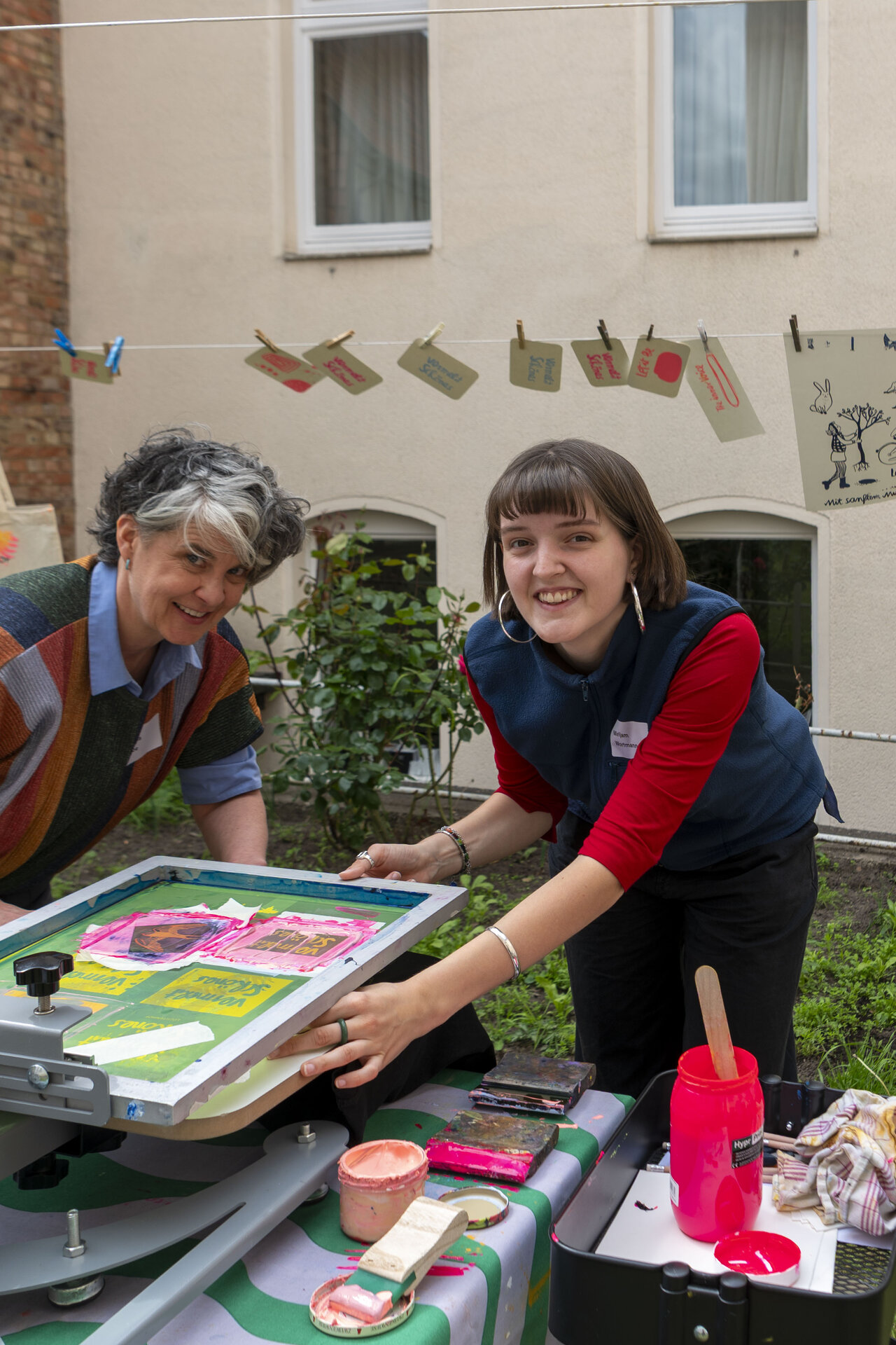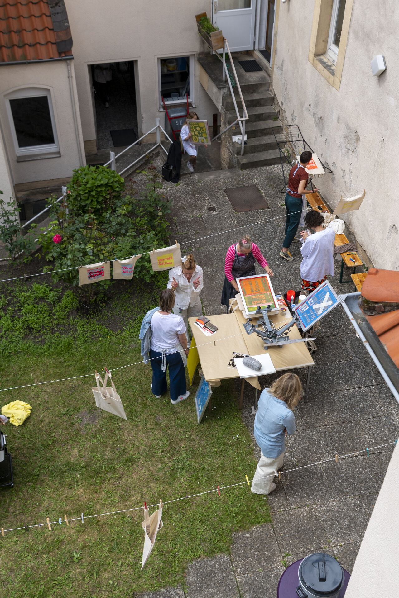 In Werkstattzeiten das Gehörte vertiefen und Schönes vermehren. Beim Siebdruck mit Werkstattleiterin Ann-Kathrin Blohmer und bei der Polaroidphotographie mit Eva Jung. Oder einfach durch die Gärten streifen, in der Bibliothek stöbern und die Ausstellung von Donata Wenders sichten.