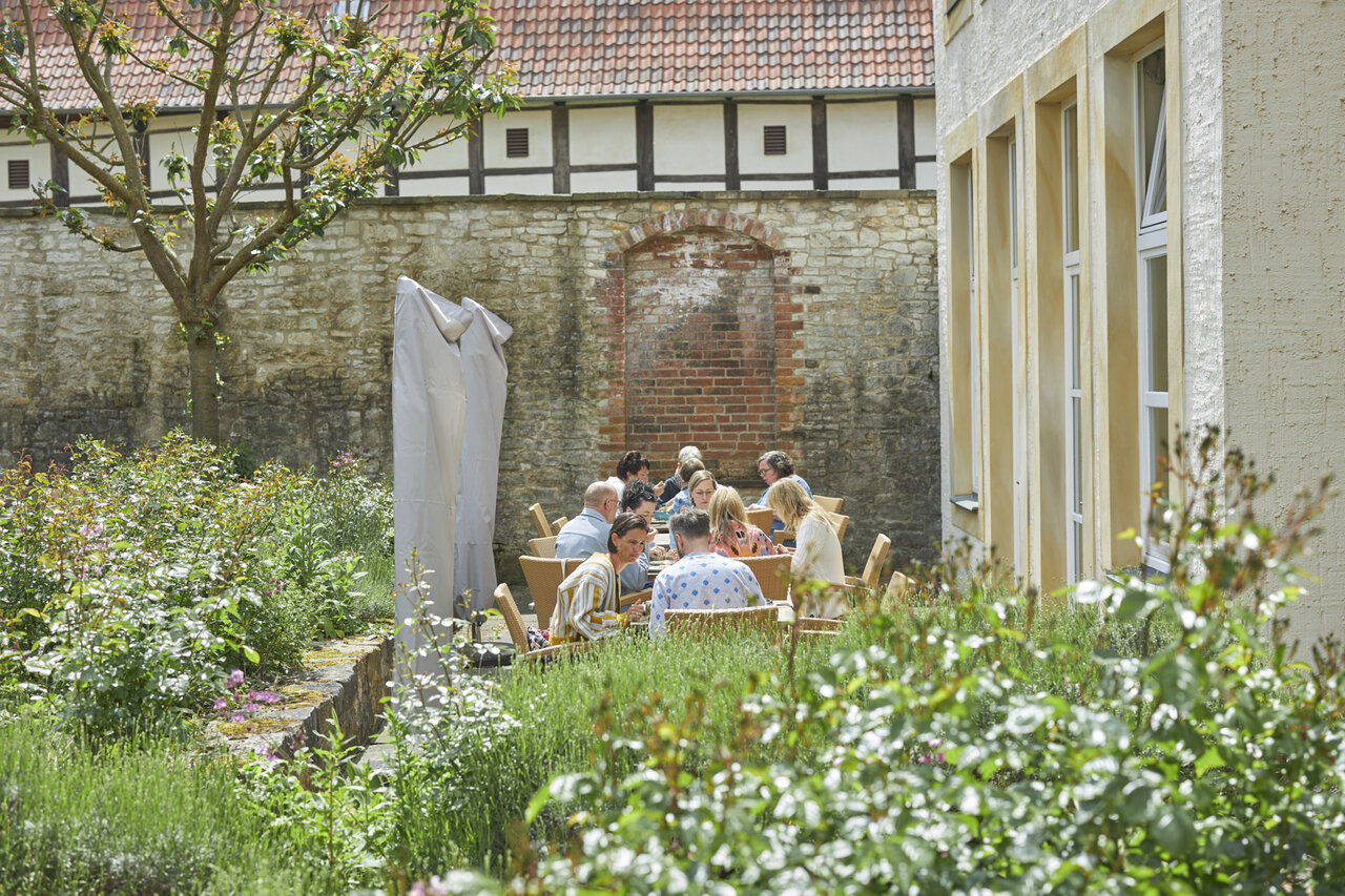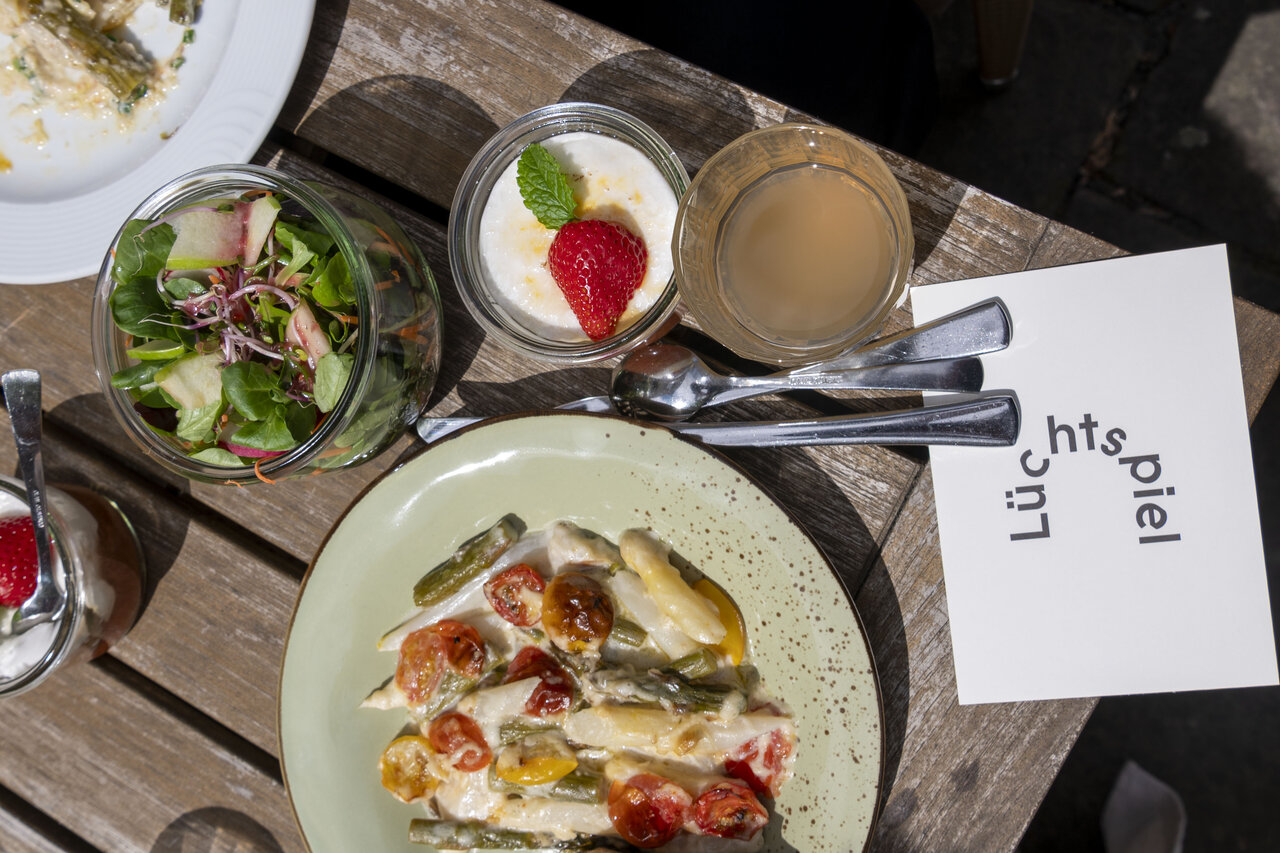 Auf der Terrasse unter offenem Himmel saisonale Kulinarik genießen. Zu unseren eigenen Veranstaltungen immer vegan. Augenweide und Gaumenschmaus zugleich.